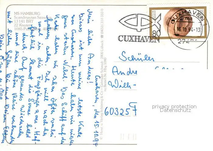 Schiffe_Ships_Navires MS Hamburg Scandinavian Seaways postalisch gelaufen 1994 Erhaltung siehe scans [PaolaD17] PaolPID1