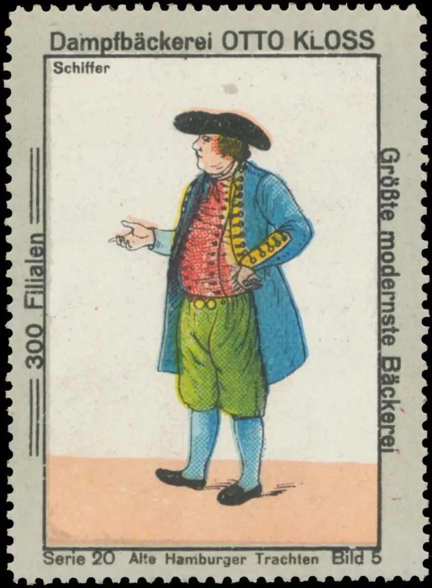 Dampfbäckerei, 300 Filialen, Serie 20 Alte Hamburger Trachten, Bild 5, Größe/Zustand: 6x4 , Fehldruck, guter Zustand, Original alte Reklamemarke die seinerzeit für die Werbung benutzt wurde