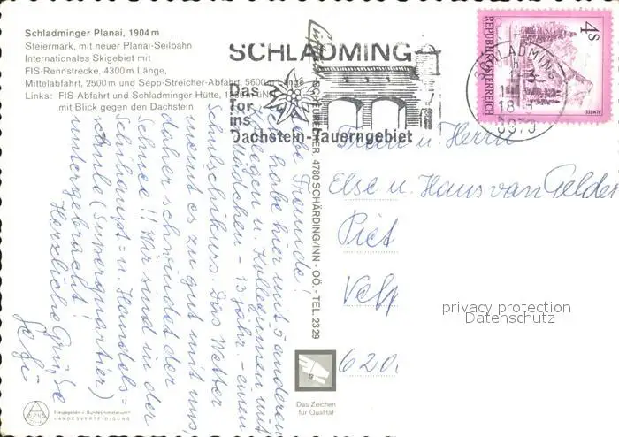 Schladming Obersteiermark Skikurs Totalansicht Planai Seilbahn Ortsblick Schladming postalisch gelaufen nach 1965 Erhaltung siehe scans Alte Ansichtskarte Postkarte WernPID4