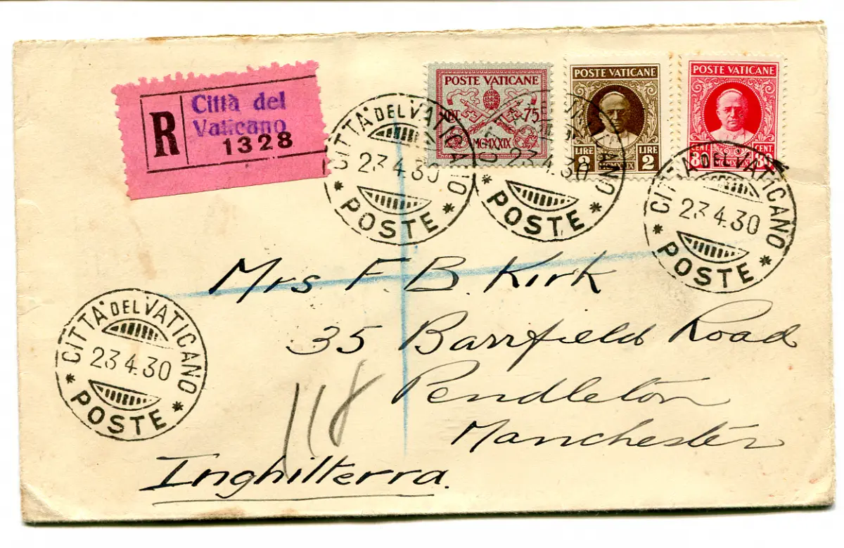 Schlichtung - Einschreiben für das Ausland Umschlag - Schlichtung Lire 2 Nr. 10 + Ergänzungen Nr. 7 + 8 auf Einschreiben (Doppelversand) für England am 23.4.30 - Ungewöhnlicher Katalog Cod.1130/WEB