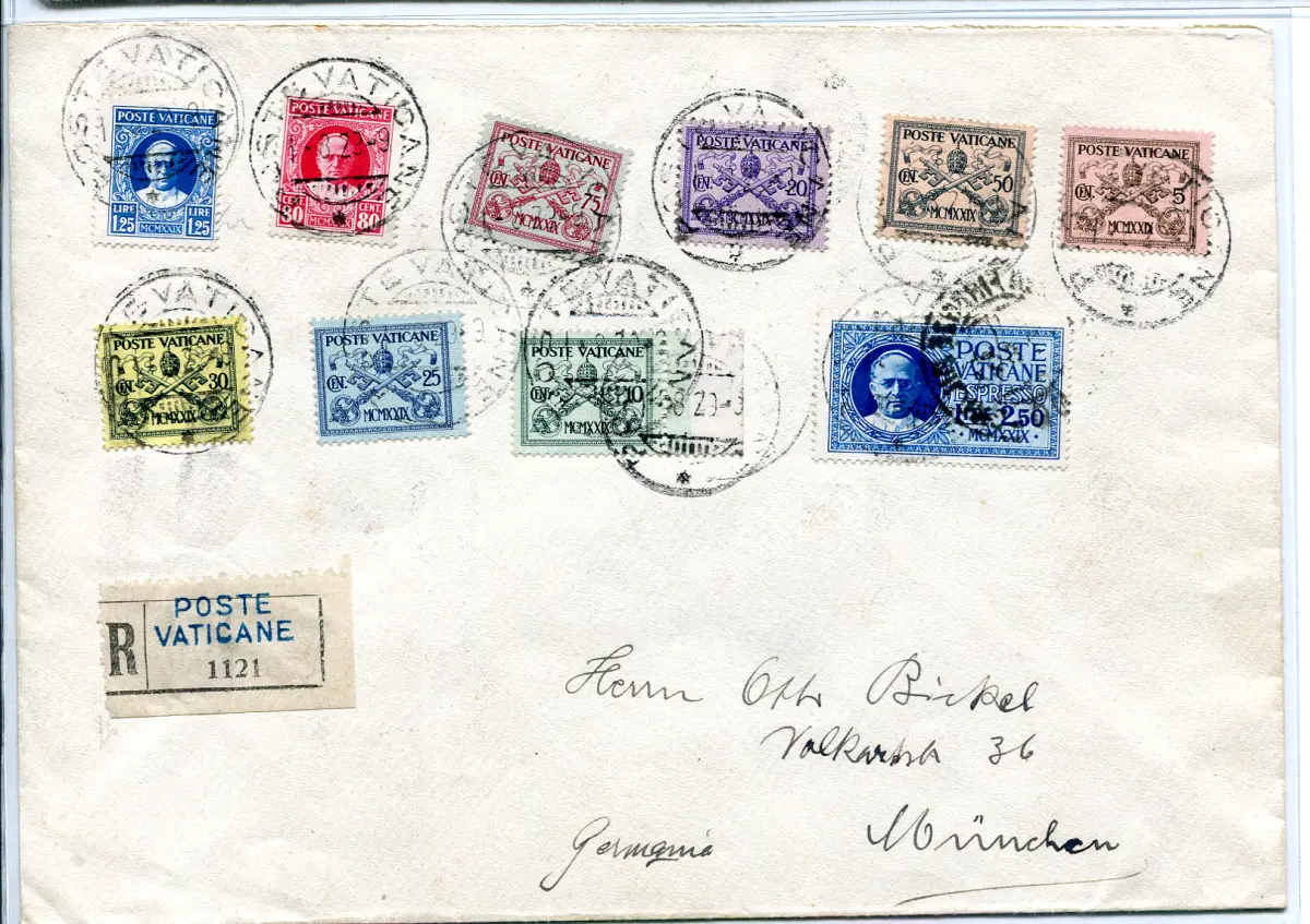 Schlichtung - Umschlag Racc. für das Ausland am 1. Gebrauchstag Umschlag - Abstimmung zehn verschiedene Werte der Serie auf Einschreiben für Deutschland am 1.8.29 Ersttag der Ausgabe und Verwendung der Vatikanmarken - Interessant für die Expressmarke ab 2,50 Lire Katalog Cod.1131/WEB