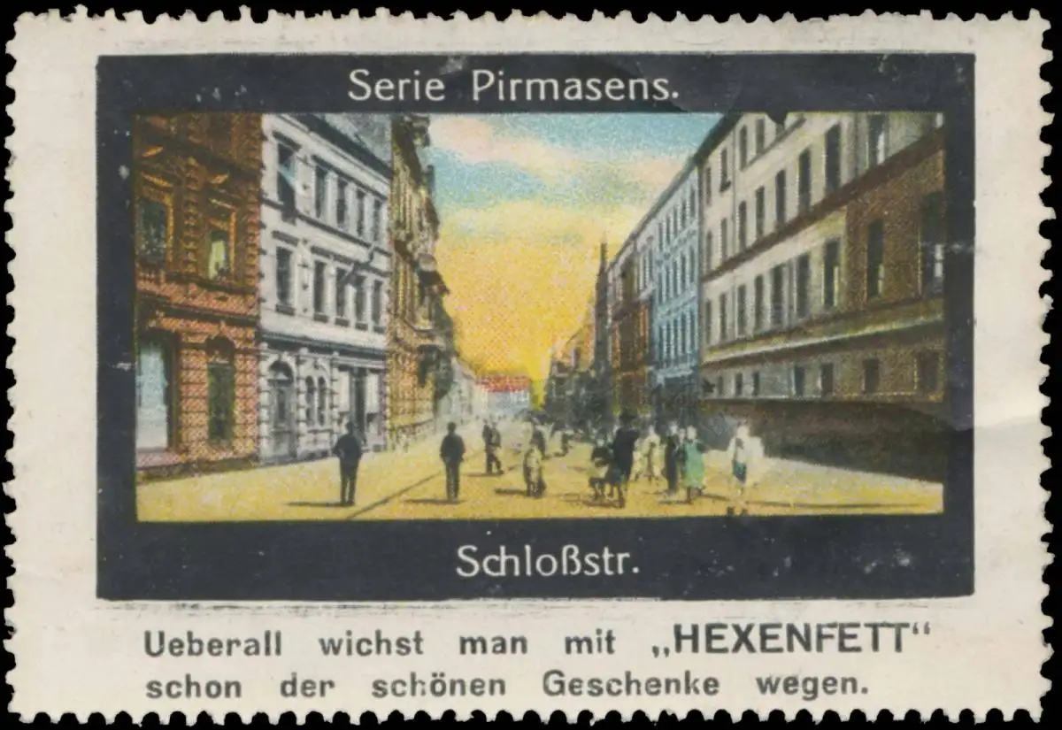 Überall wichst man mit Hexenfett, schon der schönen Geschenke wegen. Schuhputz. Serie: Pirmasens, Größe/Zustand: 5x7 , beschädigt, Original alte Reklamemarke die seinerzeit für die Werbung benutzt wurde