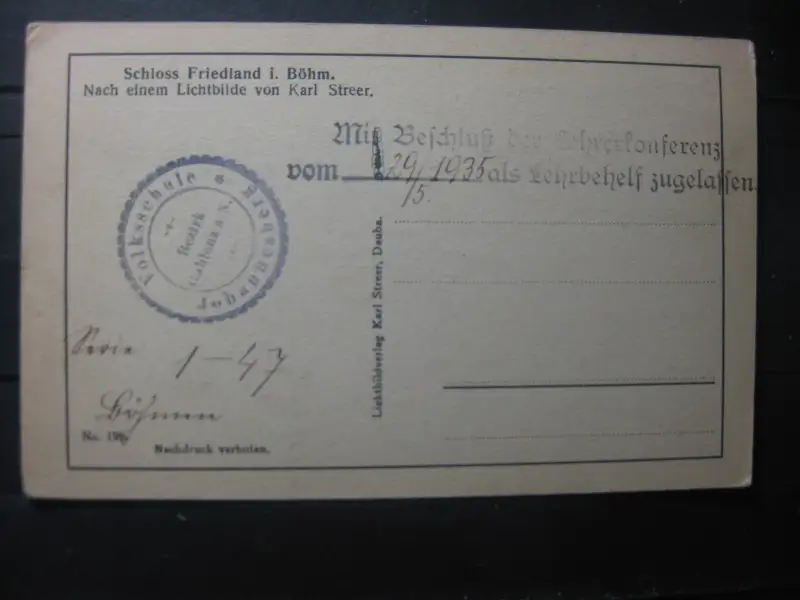 ca. 1935; Unschärfen, Spiegelungen, Verbiegungen sind allein durch das abfotografieren bedingt; Karte ist beidseitig abgebildet, Erhalt siehe Scan; ist das Foto qualitativ nicht aussagekräftig genug, kann es besseres Foto angefordert werden. Rückgabe bei Karten ist generell ausgeschlossen.