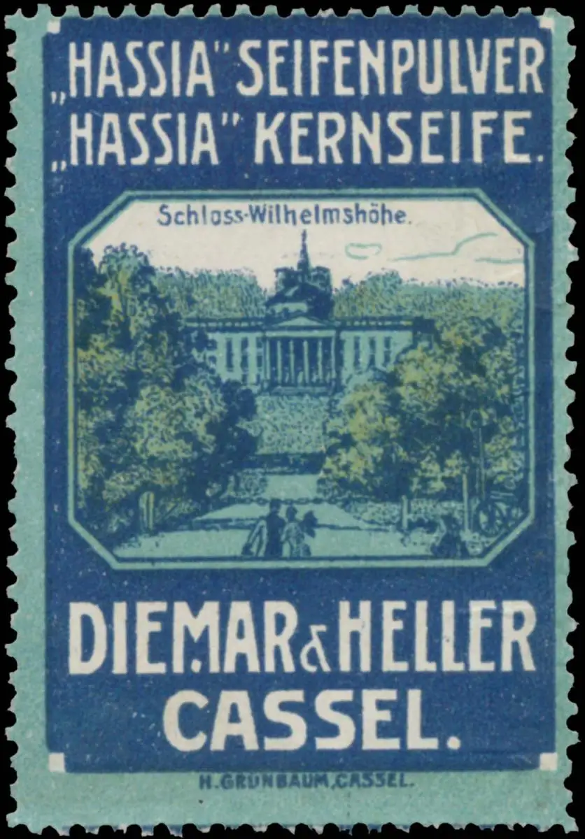 Hassia Seifenpulver & Kernseife, Seife, Druck: H. Grünbaum, Kassel, Größe/Zustand: 5x4 , guter Zustand, Original alte Reklamemarke die seinerzeit für die Werbung benutzt wurde