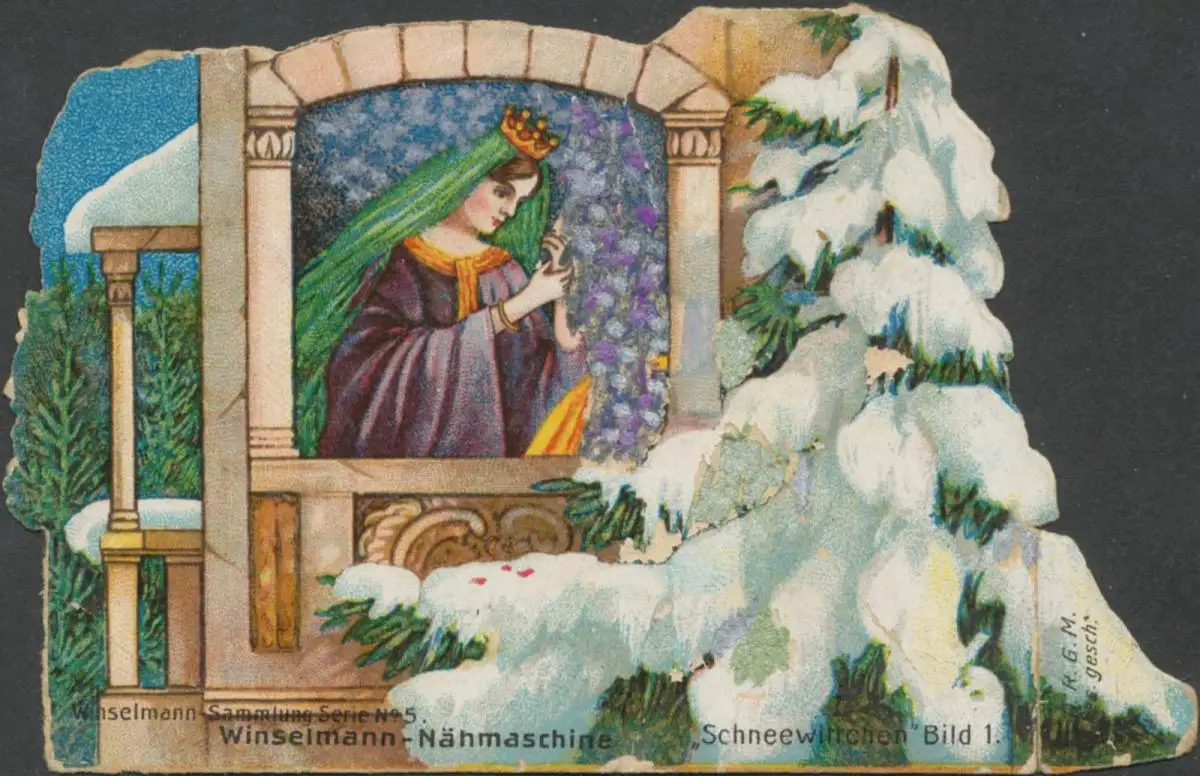 Papp-Aufsteller mit Text auf der Rückseite, Märchen, Winselmanns-Sammlung Nr. 5, Bild 1, Nähmaschine Hera Titan, Größe/Zustand: 7x11 , beschädigt, Original alte Reklamemarke die seinerzeit für die Werbung benutzt wurde