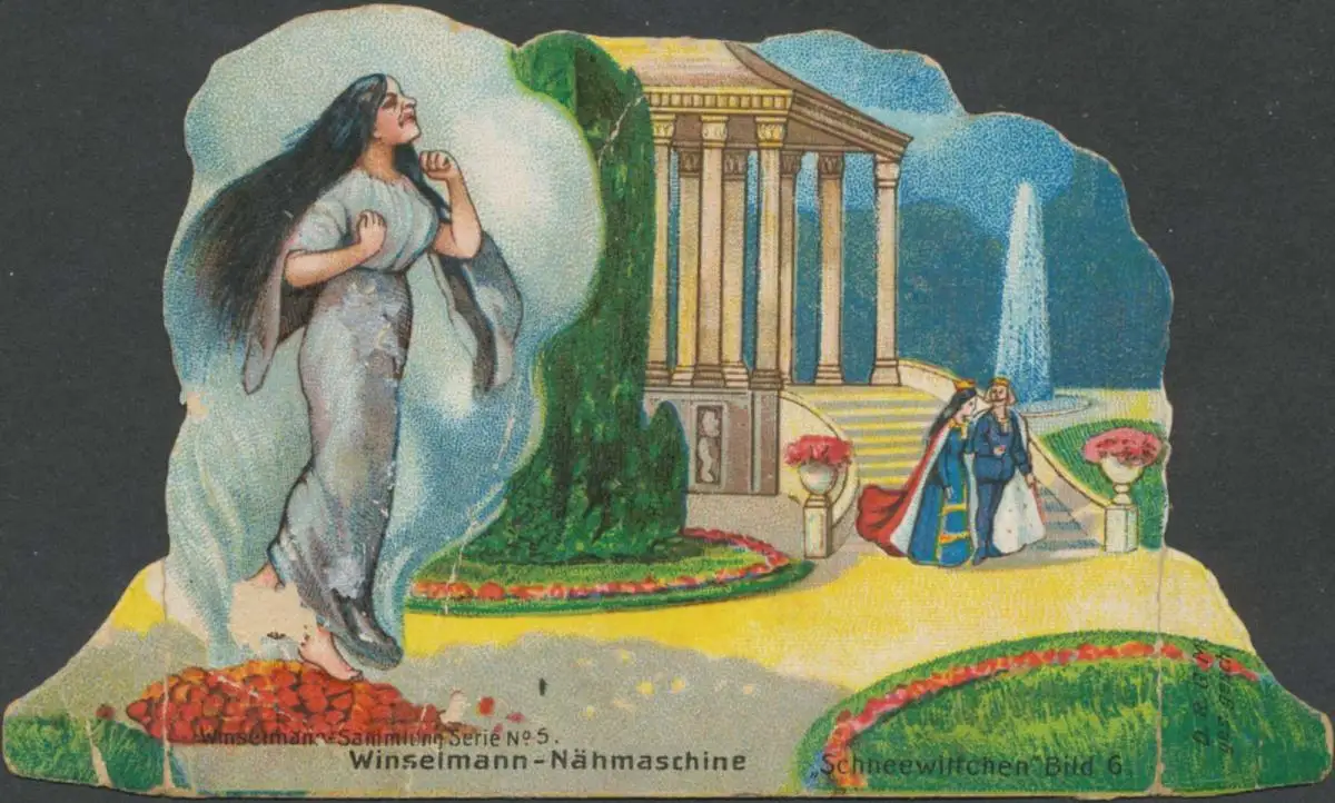 Papp-Aufsteller mit Text auf der Rückseite, Märchen, Winselmanns-Sammlung Nr. 5, Bild 6, Nähmaschine Hera Titan, Größe/Zustand: 7x11 , beschädigt, Original alte Reklamemarke die seinerzeit für die Werbung benutzt wurde