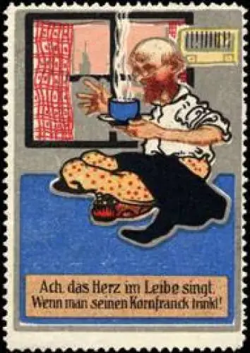 Ach, das Herz im Leibe singt, wenn man seinen Kornfranck trinkt !, Größe/Zustand: 6x4 , guter Zustand, Original alte Reklamemarke die seinerzeit für die Werbung benutzt wurde
