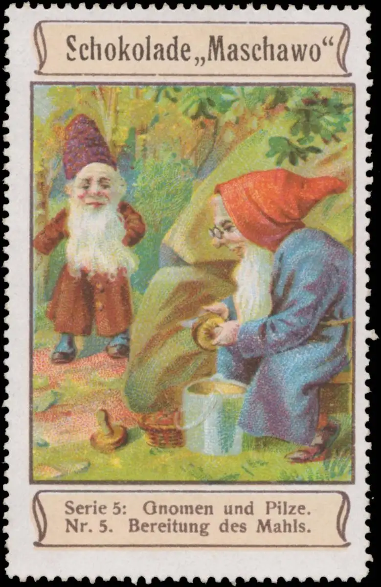 Serie 5: Gnomen und Pilze, Nr. 5 Bereitung des Mahls, Zwerge, Größe/Zustand: 7x5 , guter Zustand, Original alte Reklamemarke die seinerzeit für die Werbung benutzt wurde