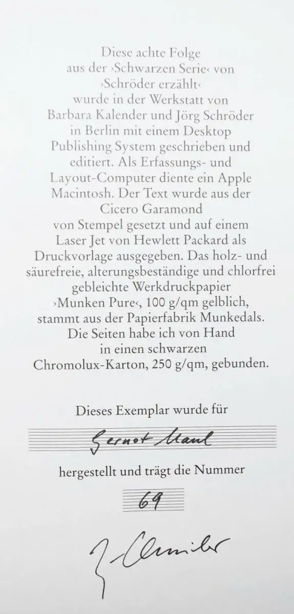 Exemplar Nr. 69. – Signiert von Jörg Schröder. – Einband mit leichten Gebrauchsspuren, sonst sehr gutes Exemplar.