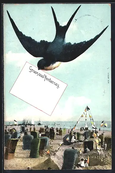 Schwalben-AK Norderney, Belebte Strandpartie mit Blick aufs Meer