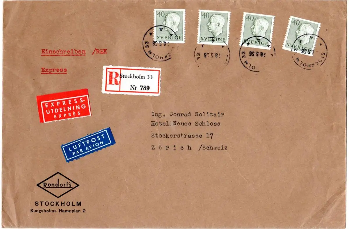 Schweden 1956, MeF 4x40 öre auf Luftpost Einschreiben Express Brief i.d. Schweiz