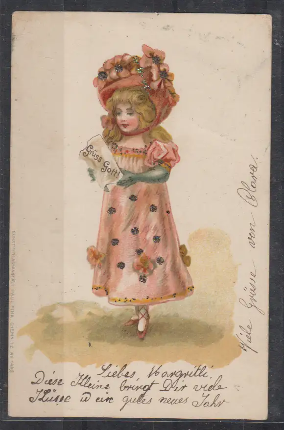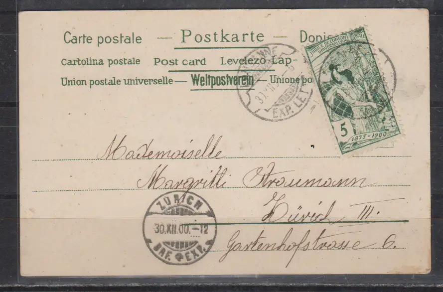 Schweiz 1900 UPU-Marke MiNo. 71 auf Color-Litho mit Glimmer " Grüss Gott "