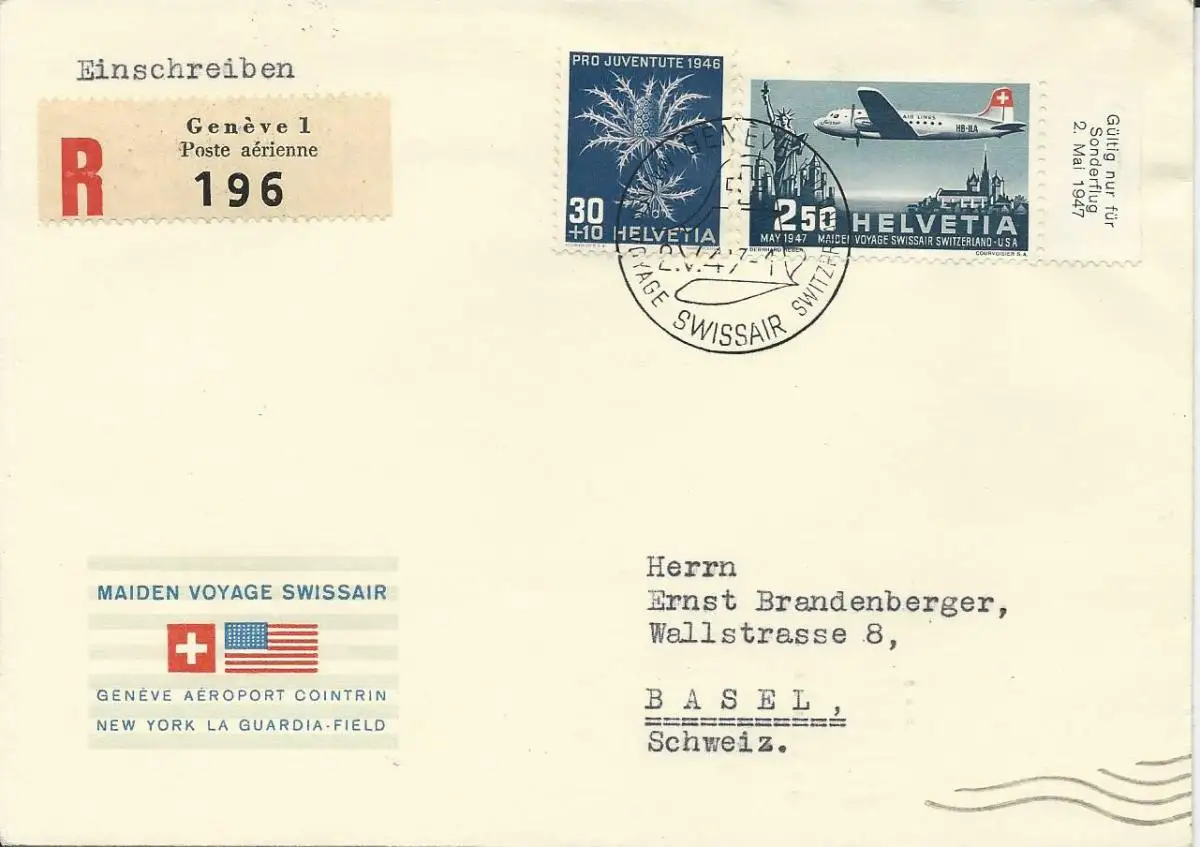 Schweiz 1947, Erstflug Genf - New York, Einschreiben Brief