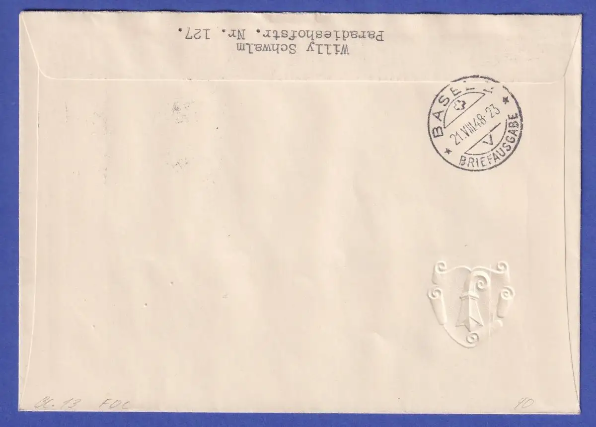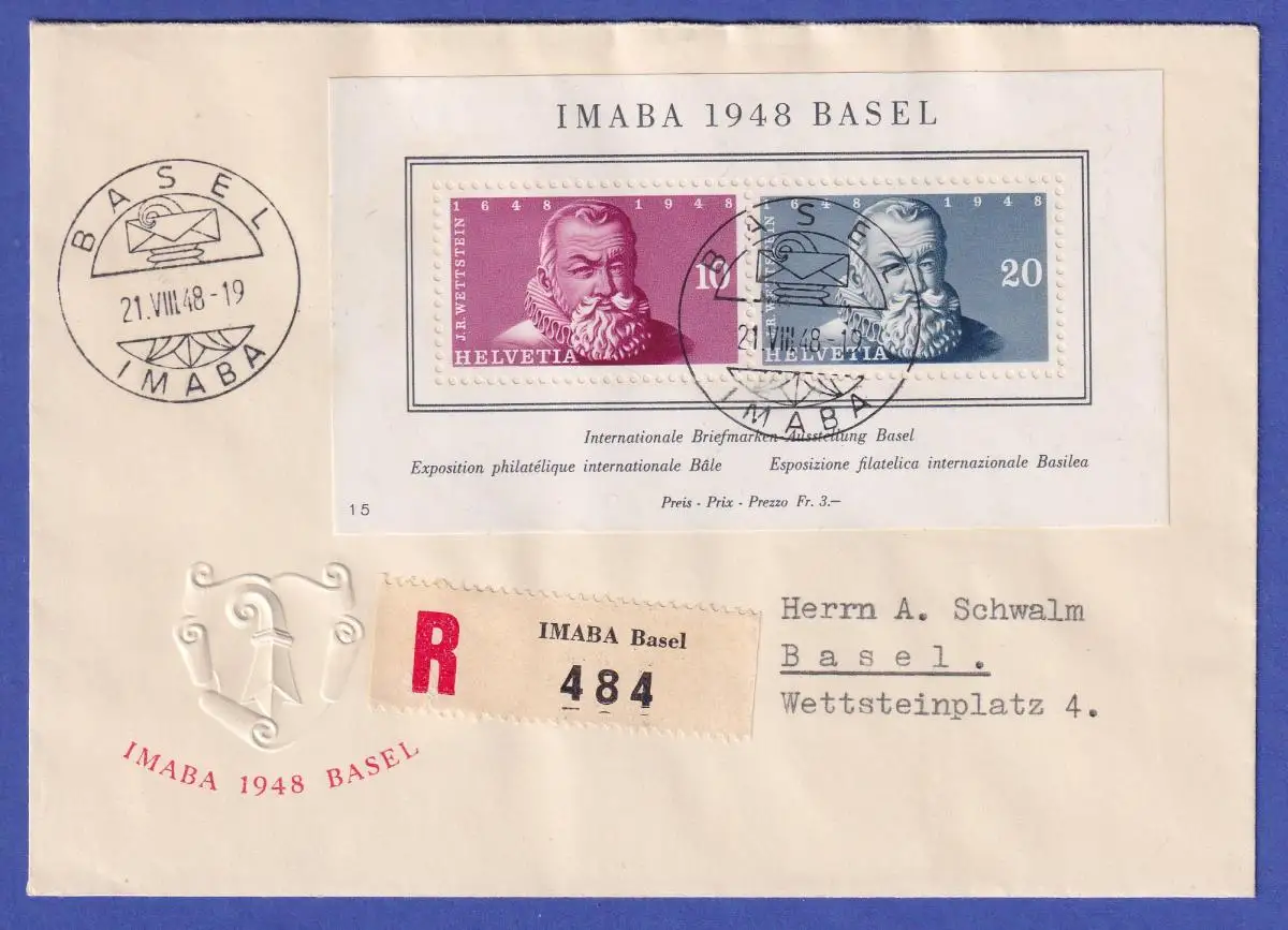 Schweiz 1948 IMABA BASEL Mi.-Nr. Block 13 auf R-FDC innerhalb von Basel