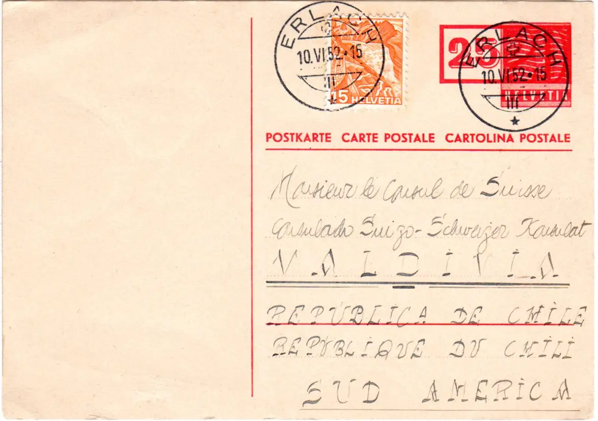 Schweiz 1952, 15 C. auf 25/20 C. Ganzsache v. ERLACH n. Chile! Destination!