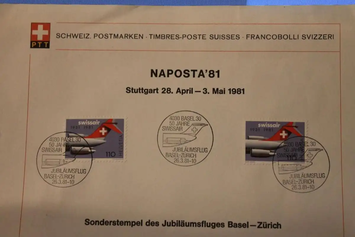 Schweiz 1981; NAPOSTA '81 Stuttgart Sonderstempel Jubiläumsflug Basel-Zürich; selten