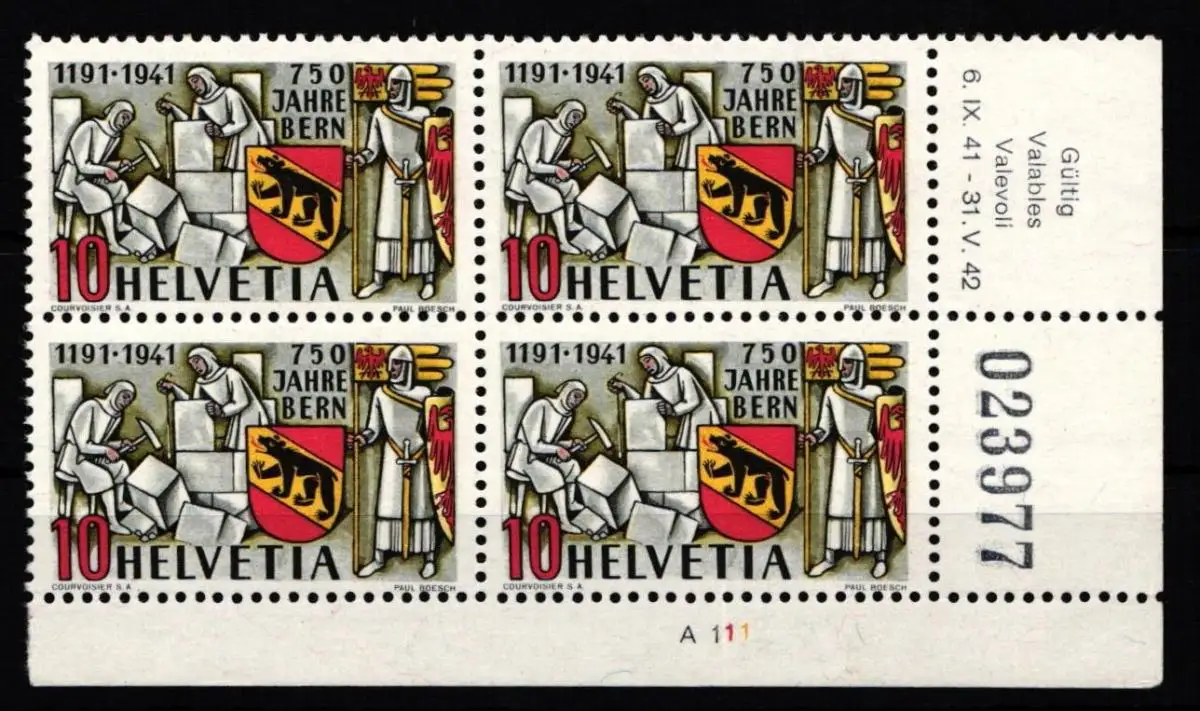 Schweiz 398 postfrisch Eckrand Viererblock Bogenzähler Formnummer #KP175