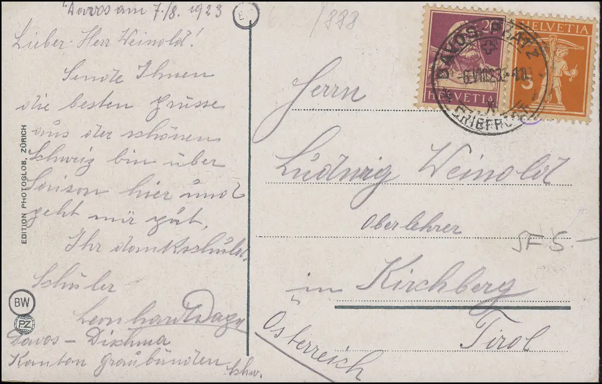 Schweiz AK 31239 Davos (1559) und engl. Sanatorium, DAVOS-PLATZ 6.8.23