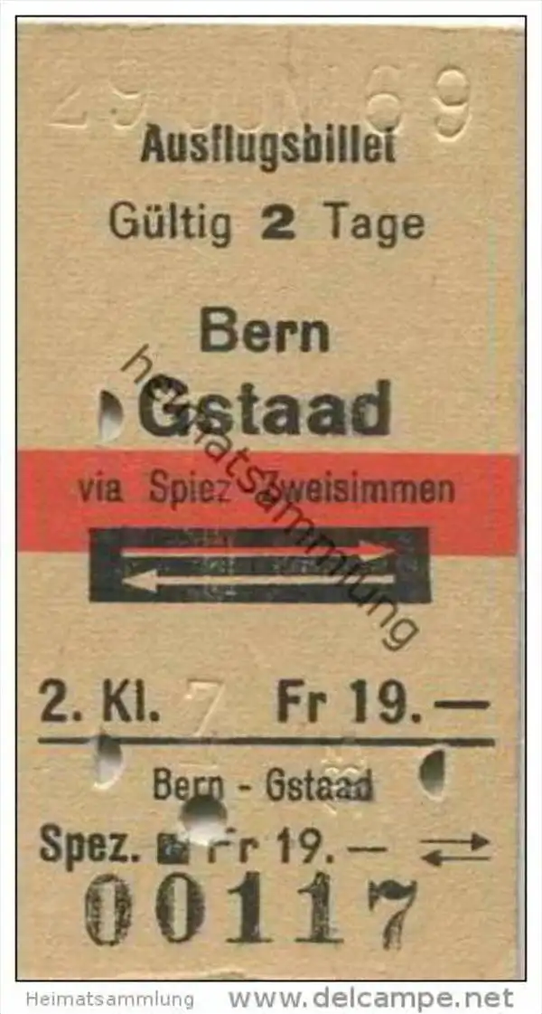 Schweiz - Ausflugsbillet - Bern Gstaad via Spiez Zweisimmen - Fahrkarte 1969 Fr. 19.-