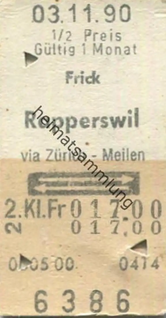 Schweiz - Frick Rapperswil via Zürich Meilen und zurück - Fahrkarte 1990 1/2 Preis