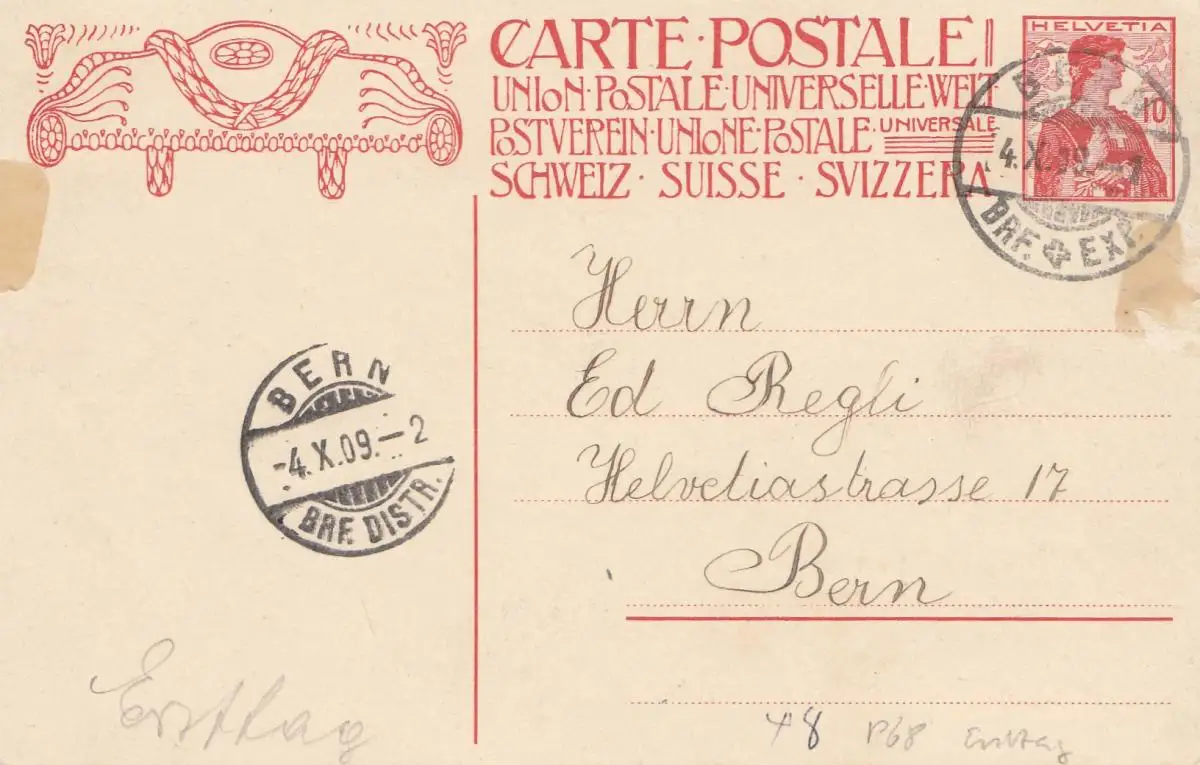 Schweiz: Ganzsache: 1909: Bern, Ersttag