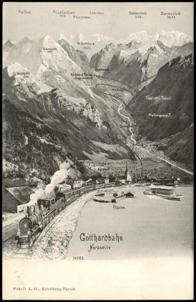 .Schweiz Gotthardbahn Eisenbahn Zug bei Flüelen, Schweizer Berge 1910