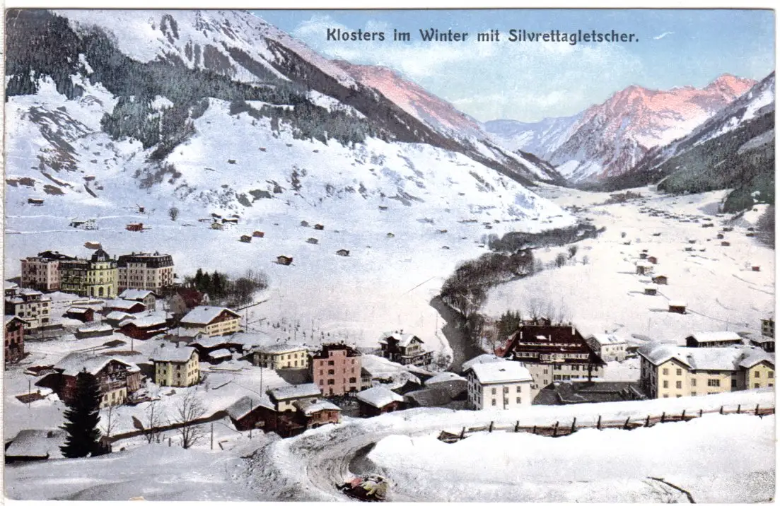 Schweiz, Klosters im Winter m. Silvrettagletscher, 1912 gebr. Farb-AK