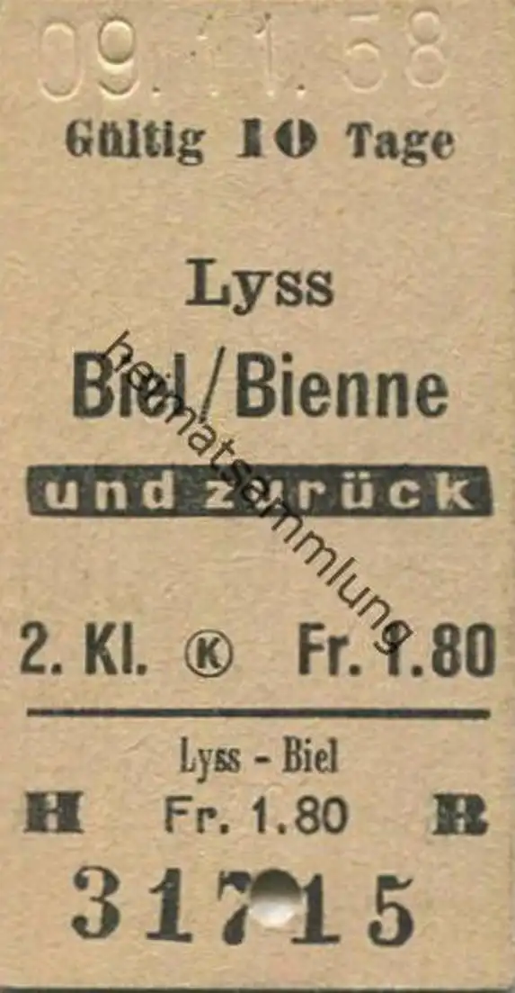 Schweiz - Lyss Biel / Bienne und zurück - Fahrkarte 1958