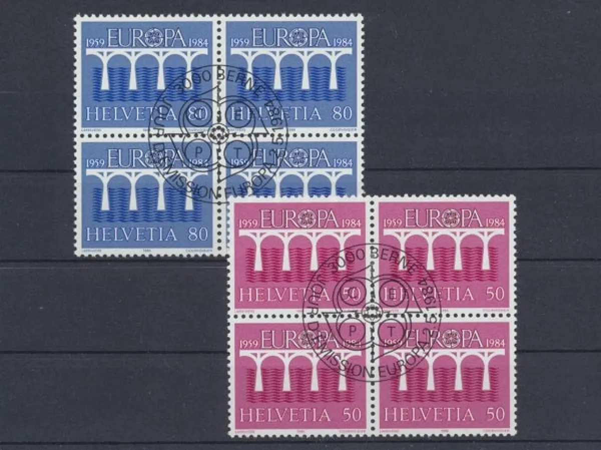 Europa 1984 - Brücke, zwei 4er Blöcke, Ersttagssonderstempel