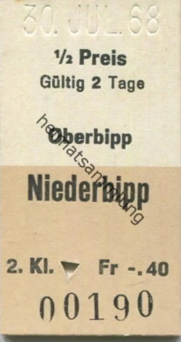 Schweiz - Oberbipp - Niederbipp - Fahrkarte 1/2 Preis 1968