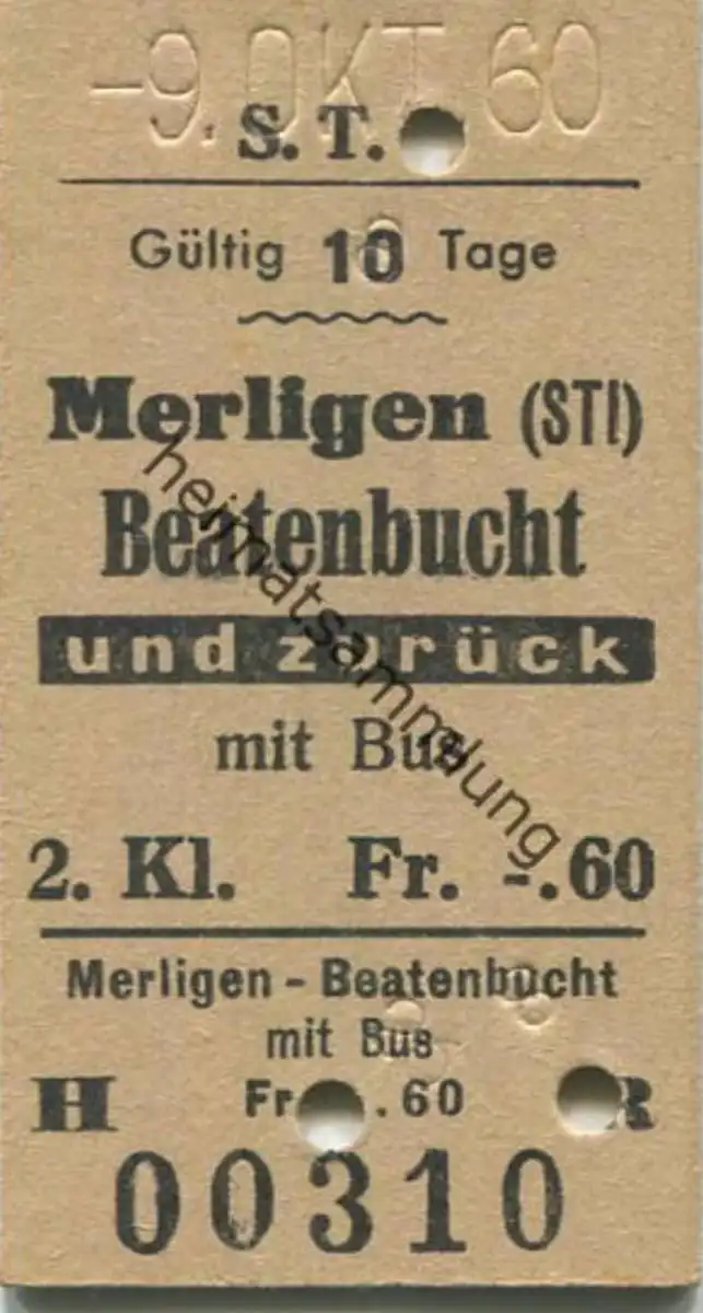 Schweiz - S.T.I. Merligen (STI) Beatenbucht und zurück mit Bus - Fahrkarte 1960