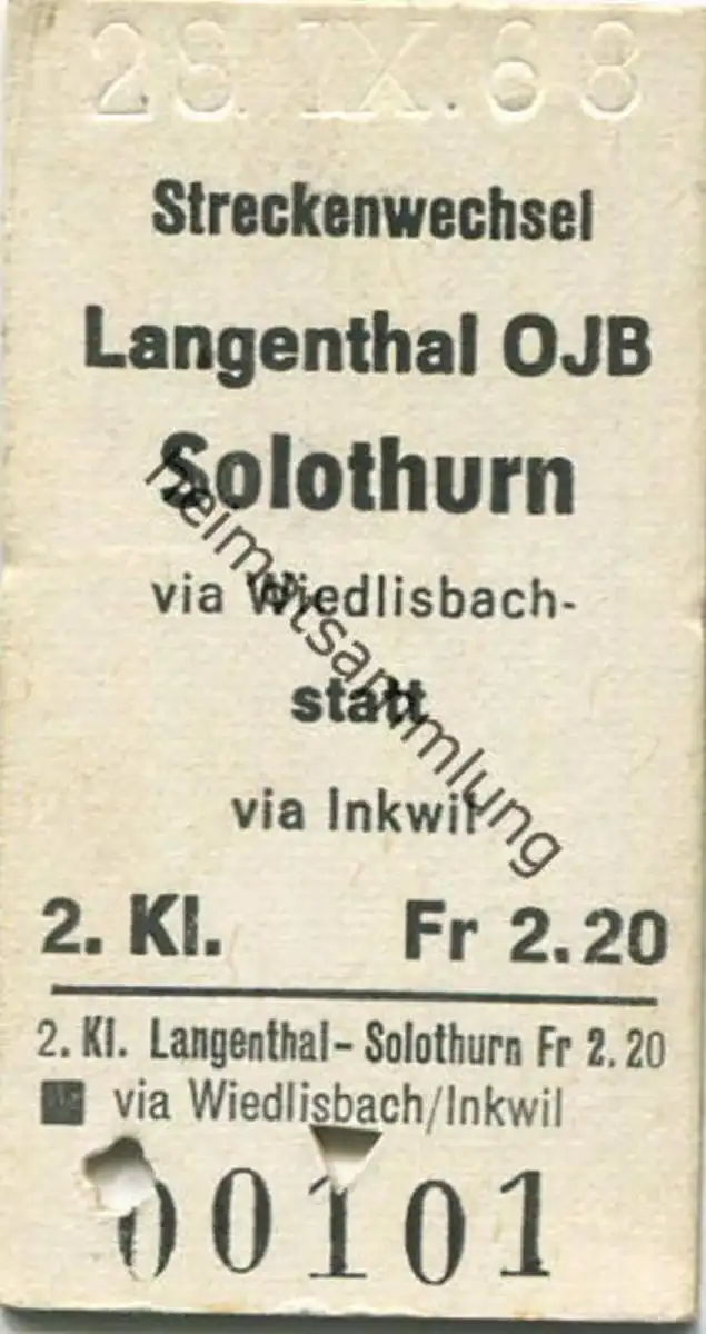 Schweiz - Streckenwechsel Langenthal OJB Solothurn via Wiedlisbach statt via Inkwil - Fahrkarte 1968