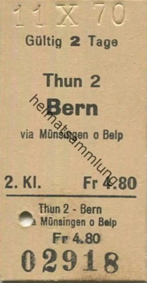 Schweiz - Thun 2 Bern via Münsingen oder Belp - Fahrkarte 2. Klasse 1970