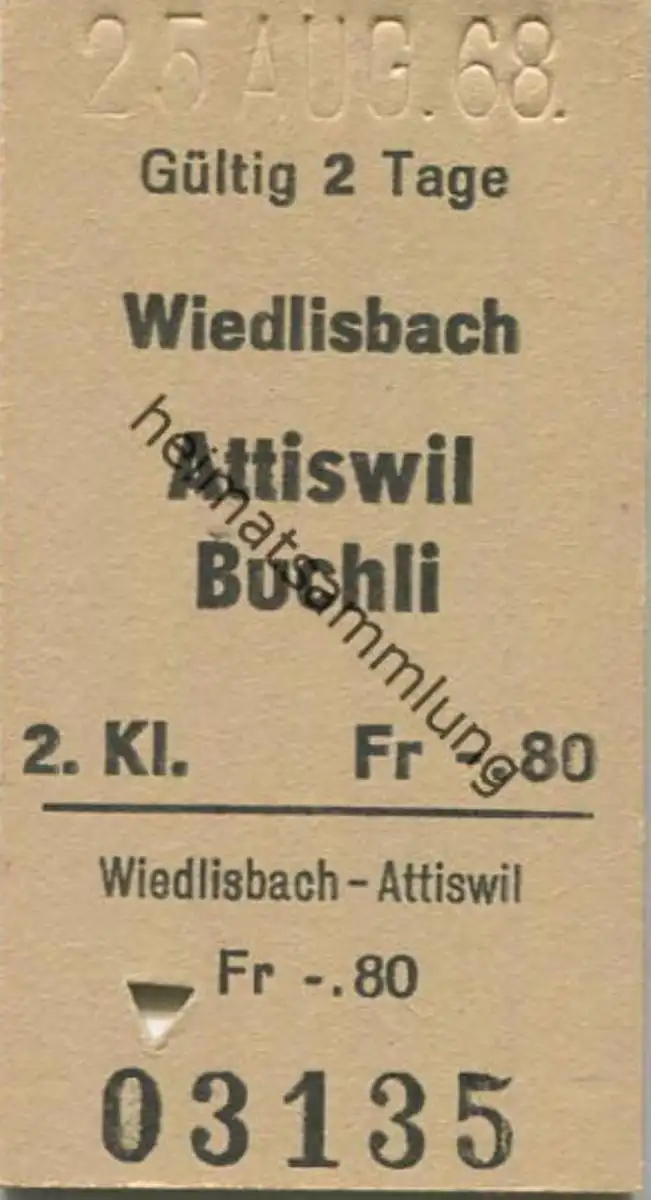 Schweiz - Wiedlisbach Attiswil Buchli - Fahrkarte 2. Kl. 1968
