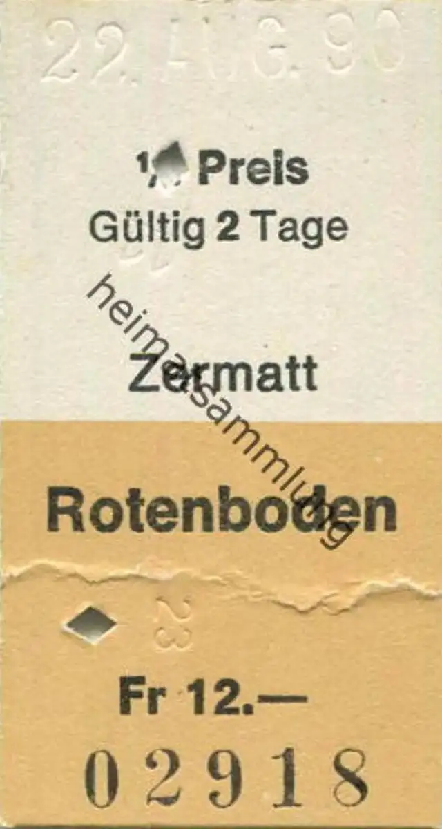Schweiz - Zermatt Rotenboden - Fahrkarte 1990 (G15116)