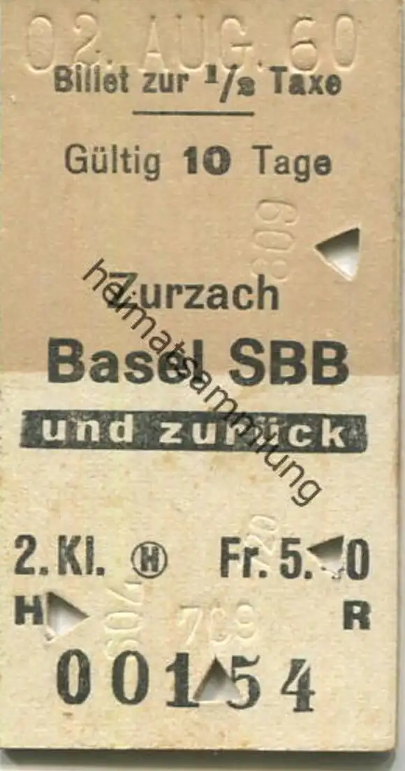 Schweiz - Zurzach - Basel SBB und zurück - Fahrkarte 1/2 Taxe 1960