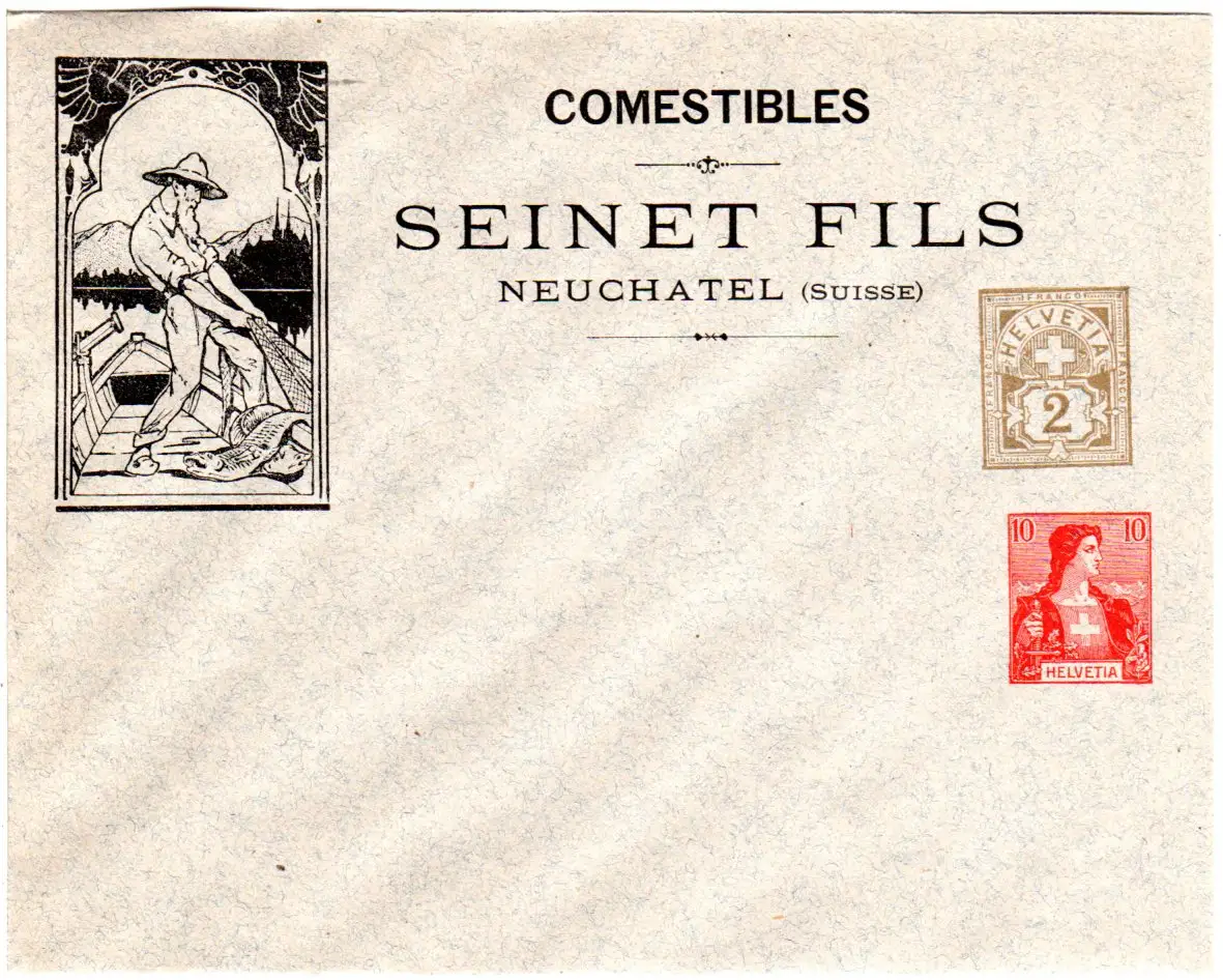 2+10 C. Privtganzsachenumschlag Comestibles Seinet Fils Neuchatel m. Abb. Fischer im Boot m. Netz u. Fischen. Sehr gute Erhaltung.