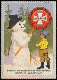 Bekannt als angenehmes Abführmittel. Erhältlich in Apotheken. Apotheker Richard Brandt, Bild 1, Junge mit Schneemann, Größe/Zustand: 7x5 , guter Zustand, Original alte Reklamemarke die seinerzeit für die Werbung benutzt wurde
