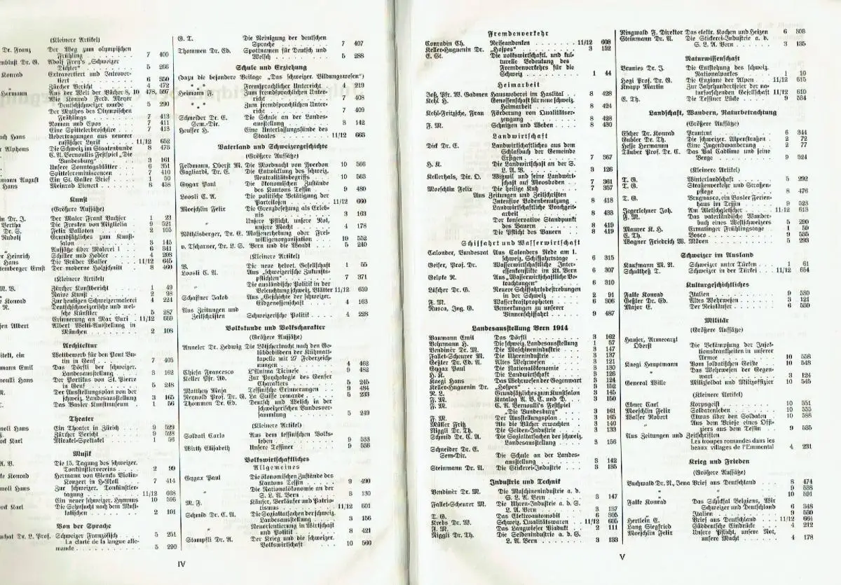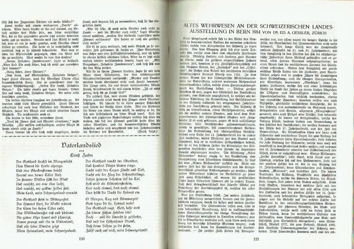 sehr guter Zustand, geringe Gebrauchs- und Alterungsspuren: Rückseite leicht beschabt - Seiten sauber und ordentlich, Dichtungen - Lese - Lyrik - Aphorismen und Glossen - Literarisches - Kunst - Architektur (Genf und Landesausstellung u. a.) - Theater (in Zürich) - Musik - Von der Sprache - Schule und Erziehung - Vaterland und Schweizergeschichte (Mordnacht von Yverdon, Neutralitätsbegriff, Grenzbesetzung u. a.) - Volkskunde und Volkscharakter (Lötschertracht, Genf, Tessin u. a.) - Volkswirtschaftliches (Kanton Tessin, Weberei, Schnitzen, Schlafbuch der Gemeinde Erfigen, Witzwil, Schifffahrt u. a.) - Landesausstellung Bern 1914 - Industrie und Technik (Maschinenindustrie, Uhren, Elektroautomobil, Seide, Stickerei u. a.) - Naturwissenschaft - Landschaft, Wandern, Naturbetrachtung - Schweizer im Ausland - Kulturgeschichtliches - Militär (Infektionskrankheiten, Wehrwesen, Miliz u. a.) - Krieg und Frieden - Vom Tage - Bücherschau - Kunstblätter und Photographien, Leinen, ca. 23 x 32, 356 Seiten mit zahlreichen Bildern und Kunstblättern