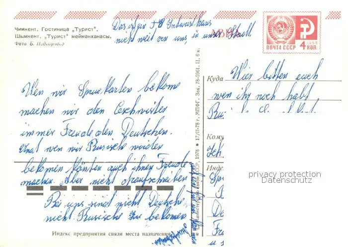 Schymkent Hotel Turist Schymkent postalisch nicht gelaufen nach 1965 Erhaltung siehe scans [DarjaD84] DarjID84
