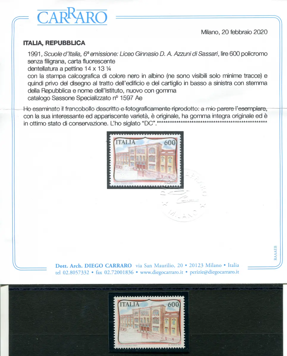 Scuole d'Italia Liceo Azuni Varieté Albino-Druck Vollgummi MNH - Scuole d'Italia Liceo Azuni Nr. 1965 mit schwarzem Albino-Kalkdruck (nur minimale Spuren davon sichtbar) daher ohne Zeichnung am Gebäudeteil und Schild unten links - Selten, wenige bekannte Exemplare - Cert. D. Carraro (Sass. spec. Nr. 1597 Ae) Cod. 690/16