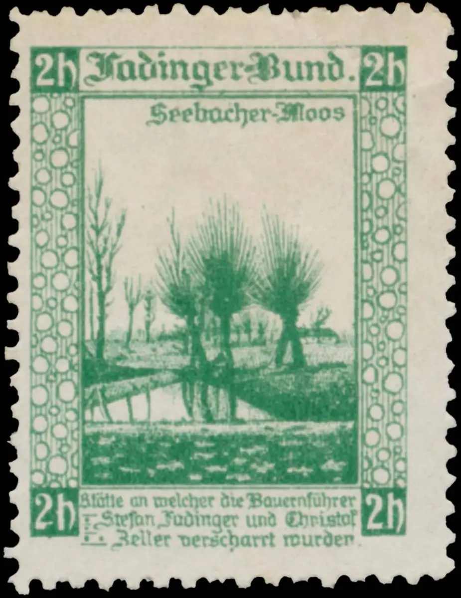 Stätte an welcher die Bauernführer Stefan Fadinger und Christof Zeller verscharrt wurden. Spendenmarke, grün , Größe/Zustand: 3x4 , guter Zustand, Original alte Reklamemarke die seinerzeit für die Werbung benutzt wurde