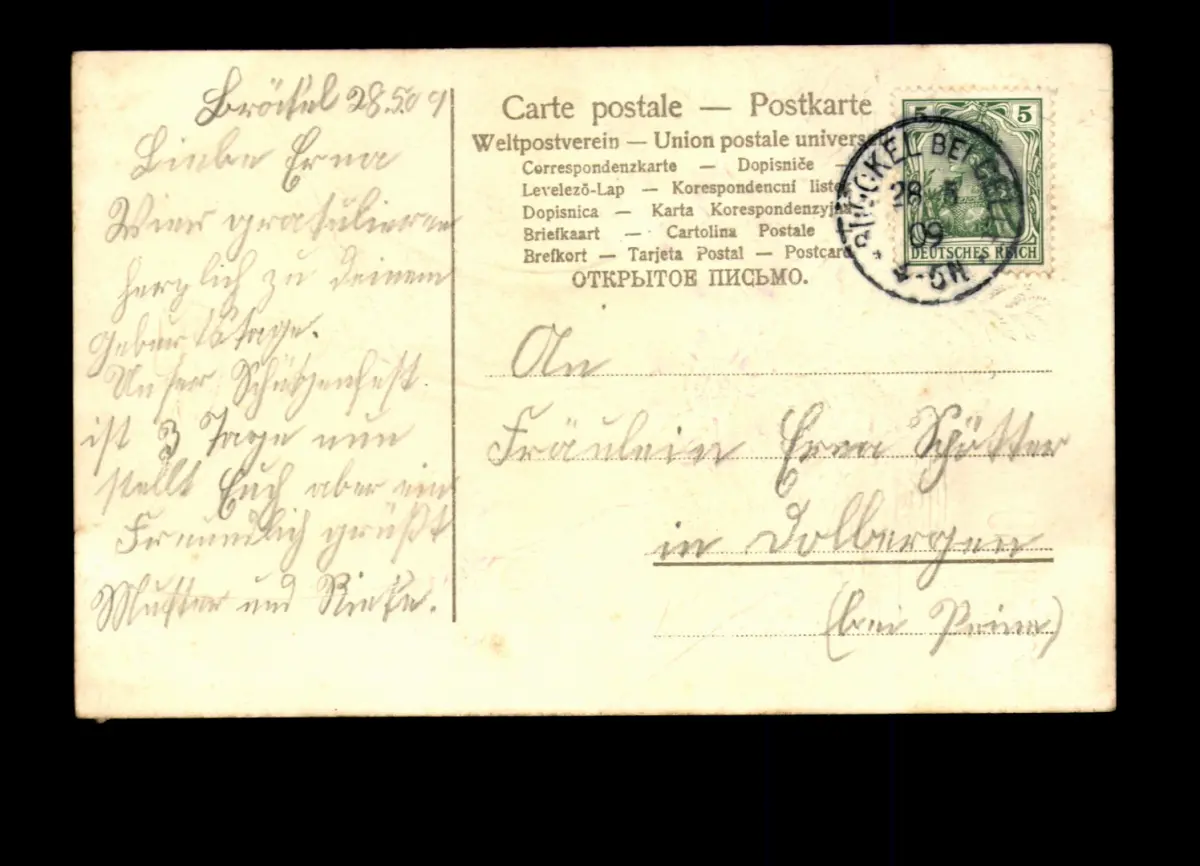 Prägekarte, gelaufen, Ecken bestoßen, leicht fleckig, Eckknick links unten.