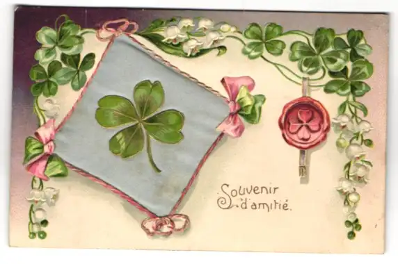 Seiden-AK Ein vierblättriges Kleeblatt auf einem Kissen, Passepartout aus weiteren Kleeblättern