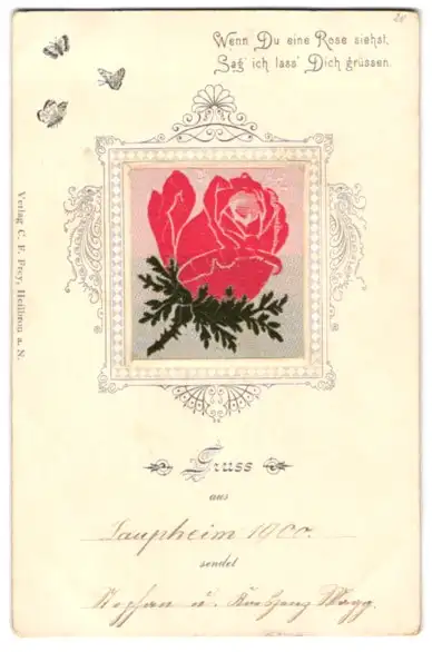 Seiden-AK Rose mit roter Blüte in Passepartout mit Schmetterlingen