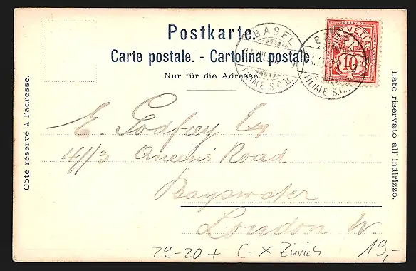 Personenbezogene Daten auf der Rückseite der Karte wurden durch blauen Textmarker unkenntlich gemacht. Die blauen Stellen sind auf die Vorderseite durchgeweicht und wirken sich negativ auf das Postkartenfoto aus