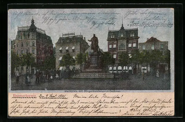 Seiden-Imitations-AK Bremerhaven, Marktplatz mit Bürgermeisterschmidt-Denkmal