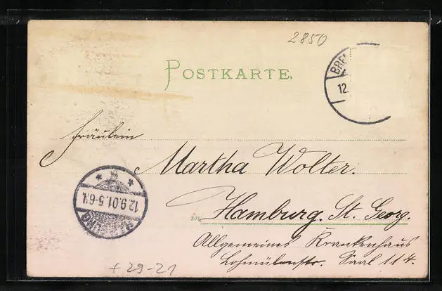 alte Ansichtskarte, gelaufen 1901, Briefmarke entferntmit Oberflächenschaden, Eckknick links oben, guter Zustand