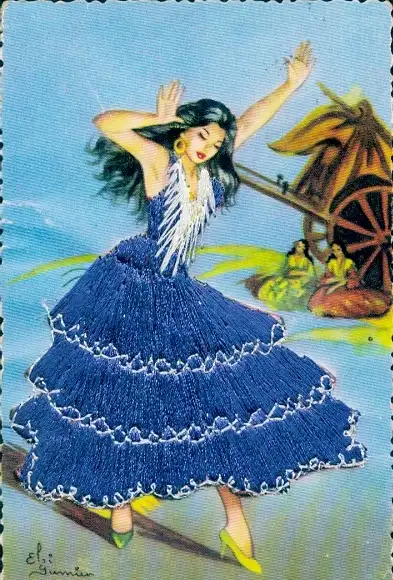 Seidenstick Ak Frau in blauem Kleid, Tänzerin, Furhwerk