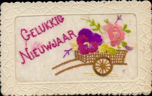 Seidenstick Ak Glückwunsch Neujahr, Blumen, Schubkarre